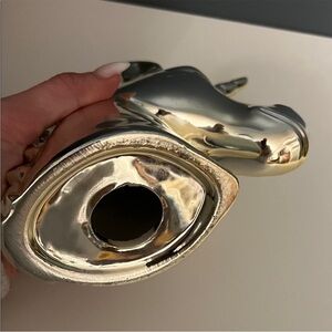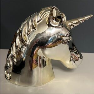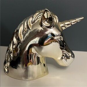 Shiny gold unicorn head decor. Perfect for adding a magical touch to any space. Great for collecting coins/cash.