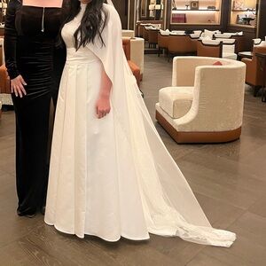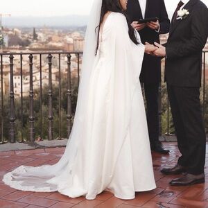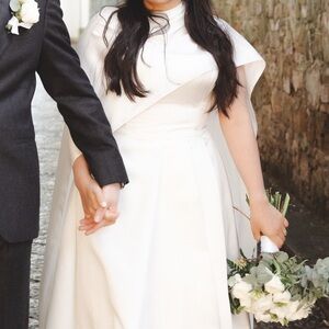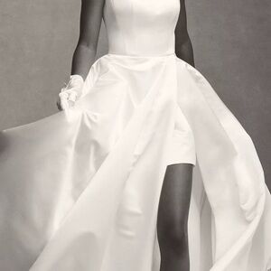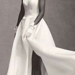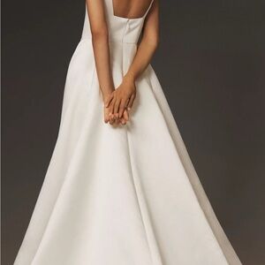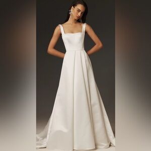 Stunning white wedding dress by Anthropologie. Features a classic square neckline and elegant silhouette. Perfect for a timeless bridal look.