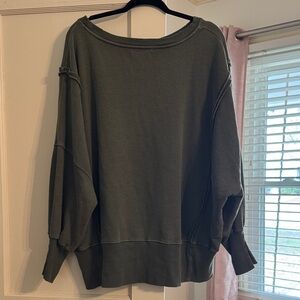 Oversized, slouchy fit with slightly lower back hemline. Very soft. Could not find the color on the website anymore but believe it is more of an olive green. Great condition!
