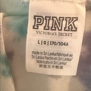 Stylish tie-dye sweatshirt with 'Pink' logo. Soft and comfortable fabric. Ideal for casual wear. This is a cut off sweatshirt with the raw him so it hang off one shoulder or both shoulders. It is so darling. The top is a large. The bottoms are a medium, but they are oversized so the bottoms will fit a large it is so cute on this is my outfit. I love it. No, it’s time to put it up for sale. If you love Victoria’s Secret then you already know how expensive this is and how beautiful it is and it’s so so soft. The spell out on the hoodie is embroidered on the pants. It is not embroidered.
