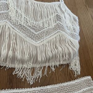 Elegant ivory skirt set with fringe accents. Ideal for a fashionable statement.