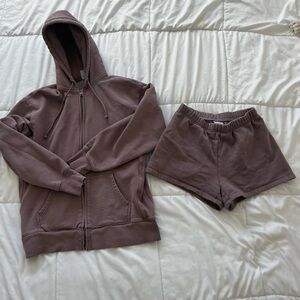Aritzia TNA Cozy Fleece Boyfriend hoodie with matching shorts. Purple/Mauve