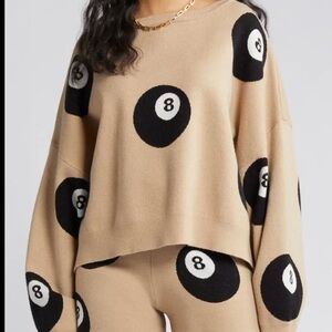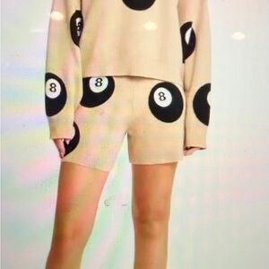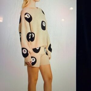 Stylish gray sweater and shorts set. Features bold black 8-ball design. Comfortable and trendy.