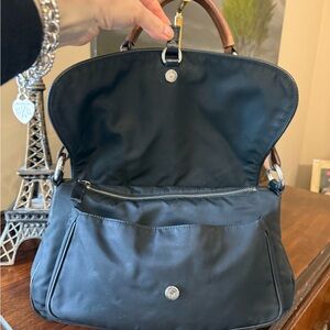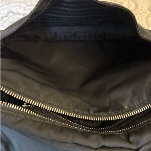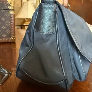 PRADA Black Tessuto Nylon Shoulder Bag with Black Saffiano Leather Bottom and trim. Has beautiful tan leather and metal detail strap. Flap with Prada logo covers small open pocket and larger zipped pouch with a small zipper pocket and flap closes with a magnetic button. Plenty of room for all the necessities. Beautiful condition, no tears or imperfections. Clean exterior and interior, This a beautiful, stylish, classic, timeless Prada bag.