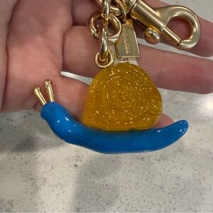 Playful Coach keychain with a snail design. Features bright blue and yellow colors. Small scratch on Coach tag. See 4th photo. Was purchased like this. Fixed tag as well because it was ripped. Was planning on using it but never did.