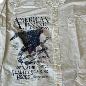 Bold American Living long sleeve button-up featuring eagle and heritage graphic print. White cotton fabric, chest pocket, button cuffs. Tag size XXL, pit to pit 24”, length 30”. Great pre-owned condition.