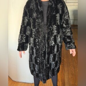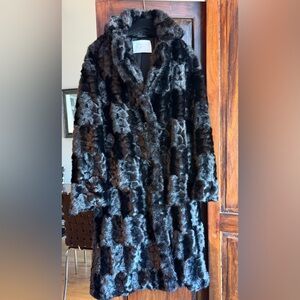 Zara Long Faux Fur Coat in a rich shiny black. The coat features a two button closure and two deep outside pockets. It’s very versatile. Can be worn for casual or dressy wear. Size: L