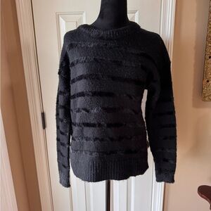 Elegant black Striped Fringe sweater with a soft, fuzzy texture by Ann Taylor. Stay warm and look stylish in this blend of 62% nylon, 34% acrylic and 4% wool. Crew neck, long sleeves as well as ribbed neckline and cuffs. Ideal for a chic and cozy outfit.