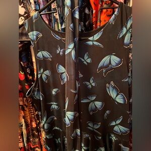 Chic high low dress with vibrant blue butterfly design. Perfect for making a statement.