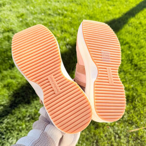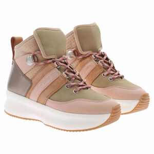 Showcasing an understated combination of powder pink, sandy beige, olive green, bronze metallic, and light tan accents, these hi-top sneakers feature a round toe and flat rubber sole.
