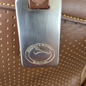 Authentic Dooney & Bourke vintage Essex satchel in rich tan leather with classic perforated design. Features dual top handles, gold-tone hardware, and original Dooney & Bourke duck logo charm. Made in USA, crafted with high-quality leather that ages beautifully.