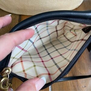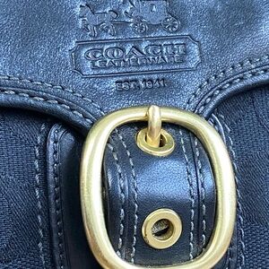 A true Bleeker collection standout, blending the line’s relaxed Y2K vibe with Coach’s iconic materials. The exterior features the classic black signature jacquard, trimmed with rich black accents and finished with warm brass hardware—a hallmark of early‑2000s Coach design.