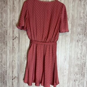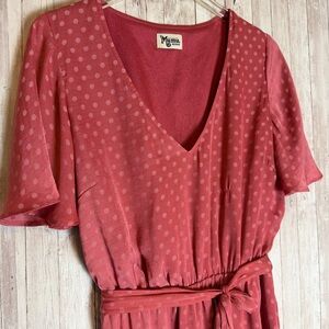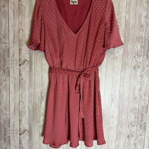 Show Me Your Mumu Anastasia Dress in a dusty rose pink with tonal polka dots. V-neckline with flutter sleeves and an elastic waist with removable self-tie belt. Flowy mini length with a soft drape.