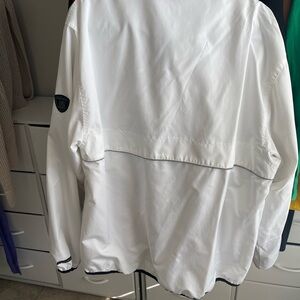 Reebok windbreaker featuring Pittsburgh Steelers logo. Crisp white color. Lightweight and sporty.