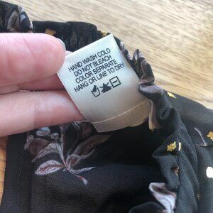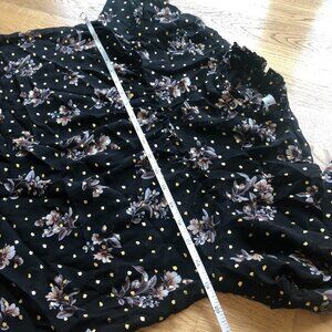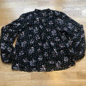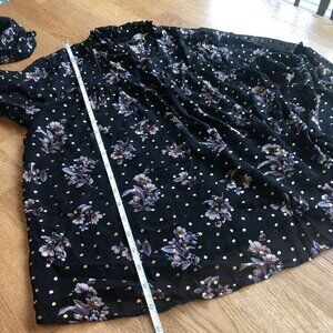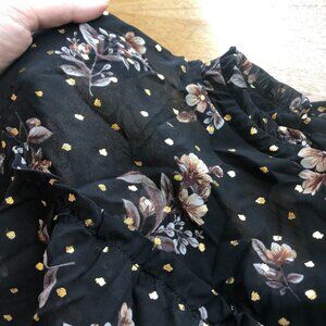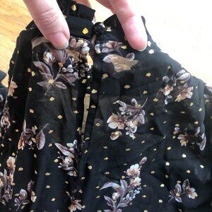 Urban Romantics black floral puff sleeve top. So cute! High neck/mock neck style. Puff/balloon sleeves. Semi-sheer material. Gorgeous black top with floral and metallic gold dot design! Size small. In great used condition with no noticeable flaws that I could find! 100% polyester. Ask any questions :) Bundle with other items for the best deal!