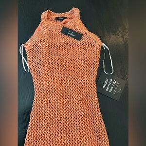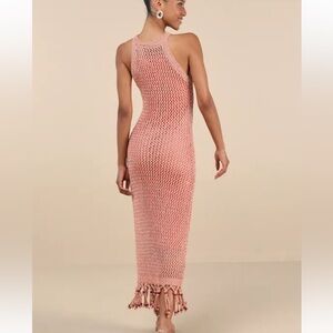 New! Lulu’s Marama Shiny Coral Crochet Sleeveless Fringe Midi Dress