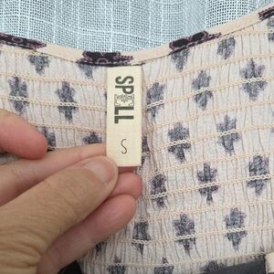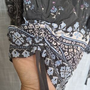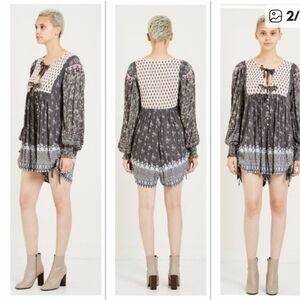 Elegant Spell short romper with bohemian patterns. Features black and cream tones. Ideal for a stylish look. front button closure with two sets of front ties. side pockets. elastic wrists. side tie ruching to gather sides just a bit. very flowy fit. excellent condition.