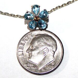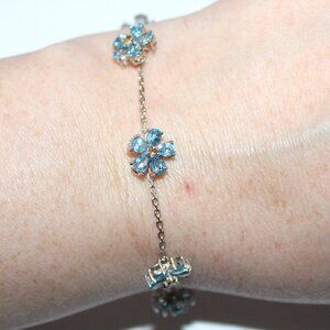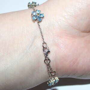 Sterling silver bracelet set with aquamarine and citrine in a flower pattern attached to delicate chain. Blue petal stones test in the aquamarine range on my presidium gem tester and the tiny yellow center stones test in the citrine range.