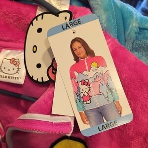 Adorable Hello Kitty fleece jacket with vibrant colors. Features a charming Hello Kitty graphic and mountain scene. Ideal for warmth and style.