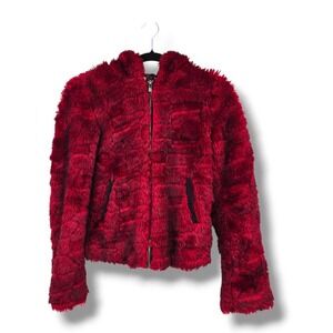 Keywords: faux fur jacket, red jacket, hooded jacket, winter coat, women's jacket, full zip jacket, faux fur coat, cozy jacket, warm jacket, fashion jacket, outerwear, furry jacket, stylish jacket, pockets, vintage, y2k,