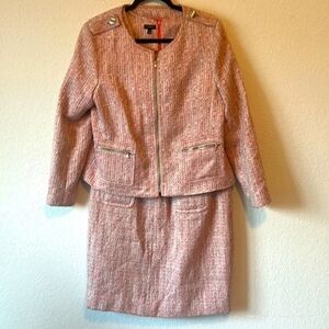 Elegant pink tweed cape jacket. Features a classic design with a textured finish. Perfect for layering.