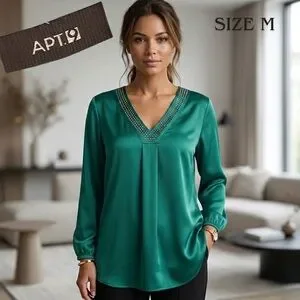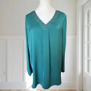 This APT. 9 "Lucky Shot" blouse features a stunning teal green jewel tone with a luxurious satin-like finish. The flattering V-neckline is detailed with shimmering metallic stud embellishments, making it a perfect choice for the office, a holiday party, or a night out.