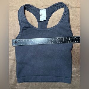 Black racerback tank with built in bra. Measurements shown in photos (laid flat).