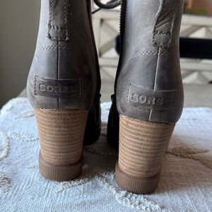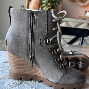 Elevate your style with these chic gray lace-up wedge boots from Sorel. Waterproof and warm. Perfect for any occasion, these boots offer both comfort and fashion.