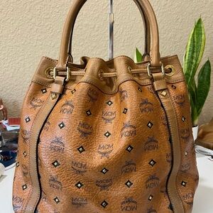 MCM COGNAC DRAWSTRING STUDDED HANDBAG