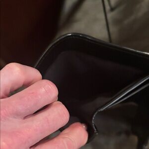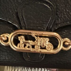 Sleek black leather wallet. Features gold emblem detail. Ideal for stylish organization.