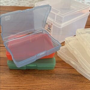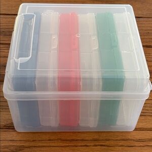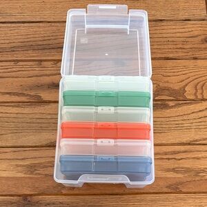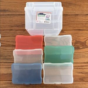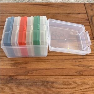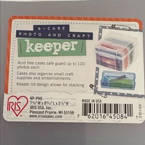 6 case photo and craft keeper. Features 6 acid free cases to safe guard up to 100 photo each cases also organize small craft supplies and embellishments. 6 latching cases fit into 1 storage box. Keeper box lid design allows for stacking. Efficiently organize with Iris storage boxes. Includes clear, green, orange, and blue compartments. Ideal for neat and safe storage.