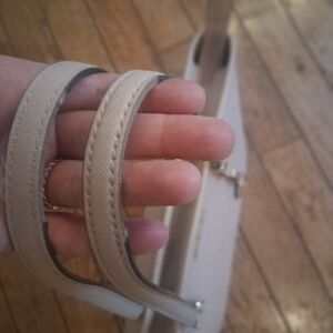 Elegant Michael Kors tote bag in beige. Features a stylish design with a logo charm.
