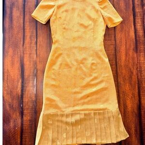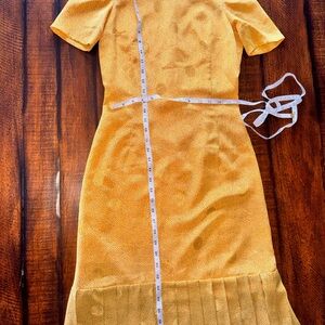 Vintage 90s golden marigold midi dress with subtle textured dot detail and a soft pleated hem.