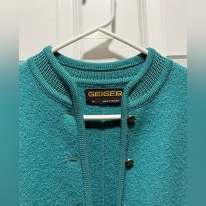 In excellent condition 100% wool blazer from the brand Geiger. Made in Austria from Geiger fabric. Metal buttons with intricate design and lovely pattern on the front. Fits size small. From smoke free home.