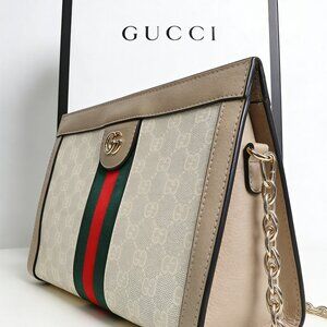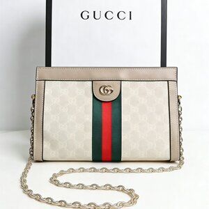 The Gucci Ophidia chain clutch reimagines a classic archival design with modern sophistication. This elegant piece is crafted in white and beige GG Supreme canvas, a signature Gucci material, with light beige leather trim. It features the iconic green and red Web stripe running vertically down the center, topped with a gold-tone metal Double G clasp, a symbol of the House's heritage. The detachable gold-tone metal chain strap allows for versatile wear—either as a clutch, shoulder bag, or crossbody. The spacious interior is lined with leather, offering ample space for daily essentials.