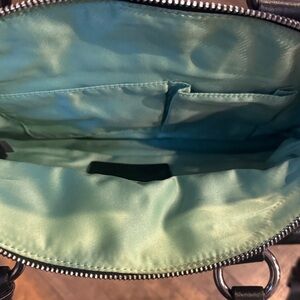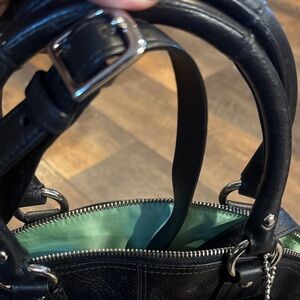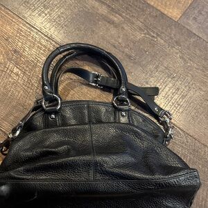 Chic black leather satchel with front pocket. Silver-tone hardware accents. Ideal for versatile styling.