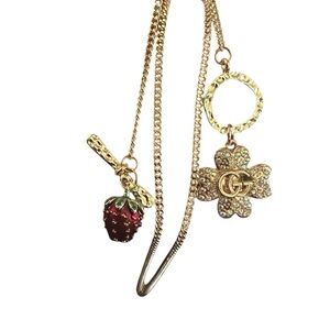 14k gold-filled micro Cuban link chain with a hammered toggle front fastener and GG clover with iridescent CZs Zipperpull pendant and additional strawberry pendant. The seven layered 14k gold bond ensures the necklace will not tarnish or fade. The necklace will be 18” unless otherwise specified at the time of purchase.
