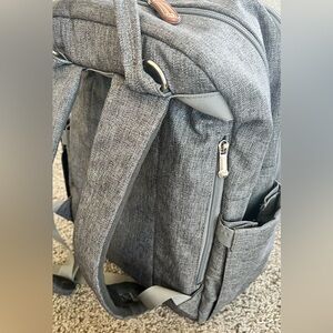 The perfect diaper backpack with bottle cooler/warmer pockets and all the compartments you need! Even has a mat for diaper changes. This has served me very well, but we have outgrown it.