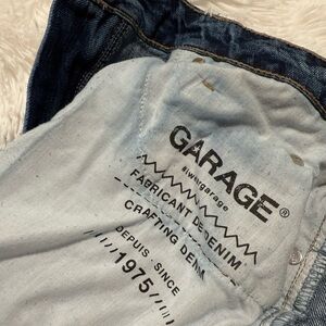The product is a pair of women's festival shorts from the brand Garage in a distressed blue denim color. These size 11 juniors' shorts have a cut-off style and are perfect for a festival-themed look. Made from denim fabric, they offer a stylish and comfortable option for casual wear.