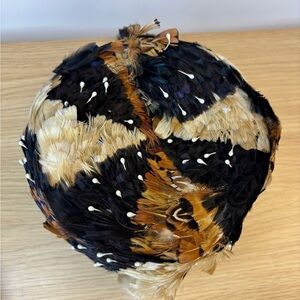 This stunning vintage hat features a unique blend of black, brown, and tan feathers, perfect for adding a touch of elegance to any outfit. The intricate design is complemented by delicate pearl accents, making it a standout accessory for any occasion. GUC see last two pics or an area with missing feathers.