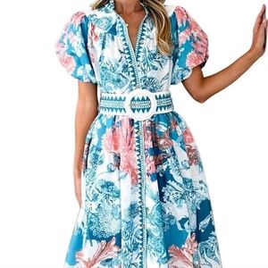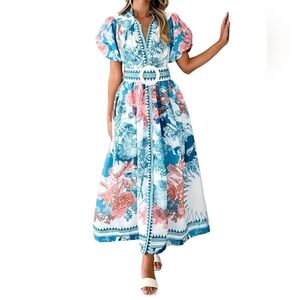 Garden Floral Button-Up Mock Neck Puff Sleeve Wide Belt Slit Front Maxi Dress