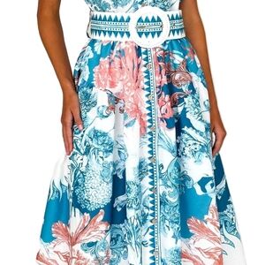 Puff sleeves add kawaii, soft volume through the shoulder line and cottagecore influences while balancing the streamlined bodice. The wide belted waist with statement buckle detail enhances definition, supporting polished and retro revival aesthetics through its bold framing effect. The mixed-scale floral placement combined with stripe paneling and scenic border illustration introduces maximalist and art-inspired influences. The decorative hem border and coordinated sleeve patterning reflect eclectic and European summer aesthetics, while the full-length skirt maintains graceful movement through its relaxed drape. A subtle front slit enhances mobility while preserving the dress’s elongated silhouette, reinforcing resort and vacation-ready influences. The structured tailoring, statement print placement, and soft volume.