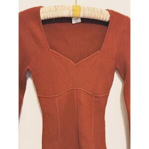 Abercrombie & Fitch ribbed sweater bodysuit in warm brown featuring a flattering sweetheart neckline and corset inspired seaming for a sculpted silhouette. Soft stretch knit with snap closure bottom, perfect for layering with denim or tailored trousers for a polished fall look.