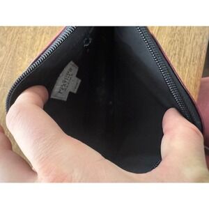 Wilsons Leather Maxima baguette bag features a unique embossed martini glass and bubble pattern on a deep burgundy or plum leather base. This vintage-inspired shoulder bag offers a slim, compact silhouette perfect for evening outings or a kitschy retro look. The interior is lined with fabric and includes a zippered security pocket for organization. A single leather strap and top zip closure complete this playful cocktail-themed accessory. Interior shows some light marks/residue as pictured.