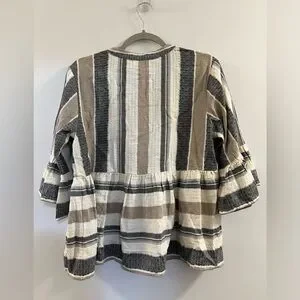 Stylish striped top with ruffle sleeves. V-neckline with button detail. Perfect for casual wear. Pit to pit measures 20 inches shoulder to hem is 23 inches.