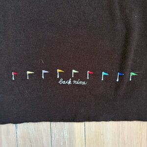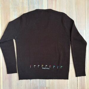 Beautiful and fun vintage vneck golf sweater in brown from Andreno Argenti. Fun gold clubs and flag motifs on front and lineup of flags on back as well. Lovely rich chocolate brown colour.