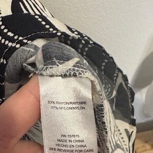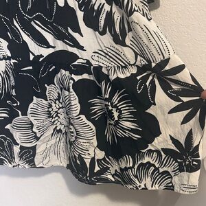Rachel Zoe size medium black and white floral dress. flowy skirt. . 3/4 sleeve. Wrap top with modesty snap button so it stays closed. Ruffle tier on skirt. Unlined. Wooden button on sleeve cuff.