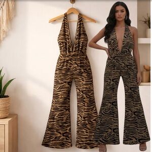 Chic animal print jumpsuit with a halter neckline. Features a deep V-cut and flared legs. Perfect for a stylish outing.