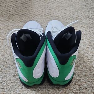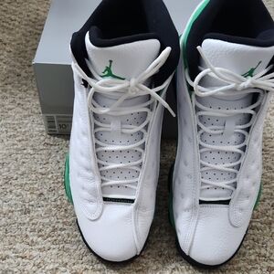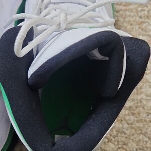 Crisp white Men's Jordans with green accents. Excellent condition, VERY lightly worn. Size 10.5, box included.