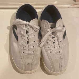 Leather canvas with navy design. Some wear. Have not tried to clean. Size 9.5. Some wear as pictured.